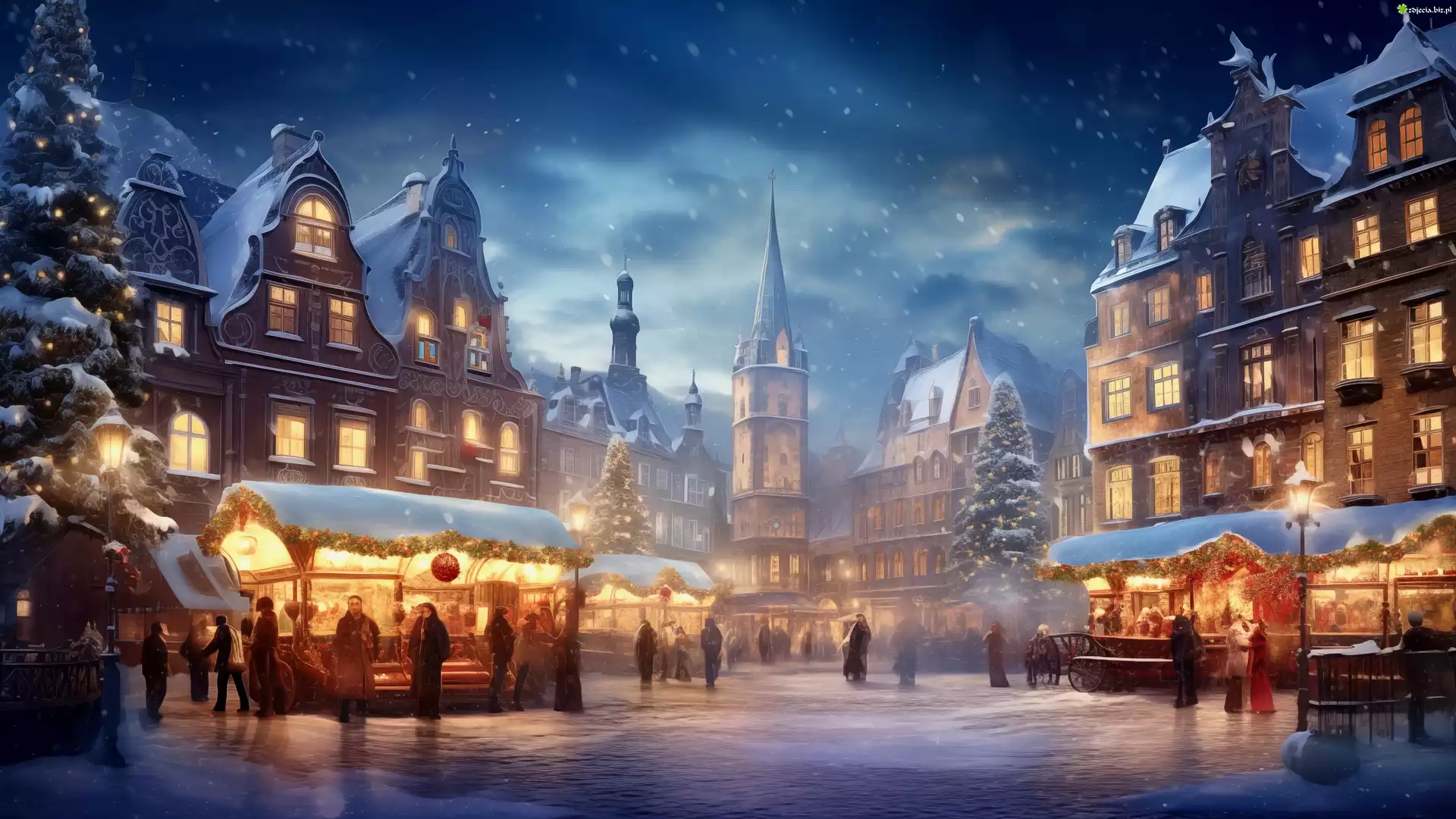 Zdjęcie Zima, Śnieg, Ludzie, Dekoracje, Stragany, Świąteczne, Choinki, Domy, Wieczór, Światła, 2D |