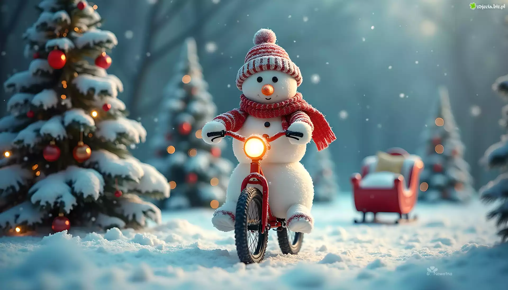 Zdjęcie Bałwan, Rower, Śnieg, Choinki, Zima, Grafika