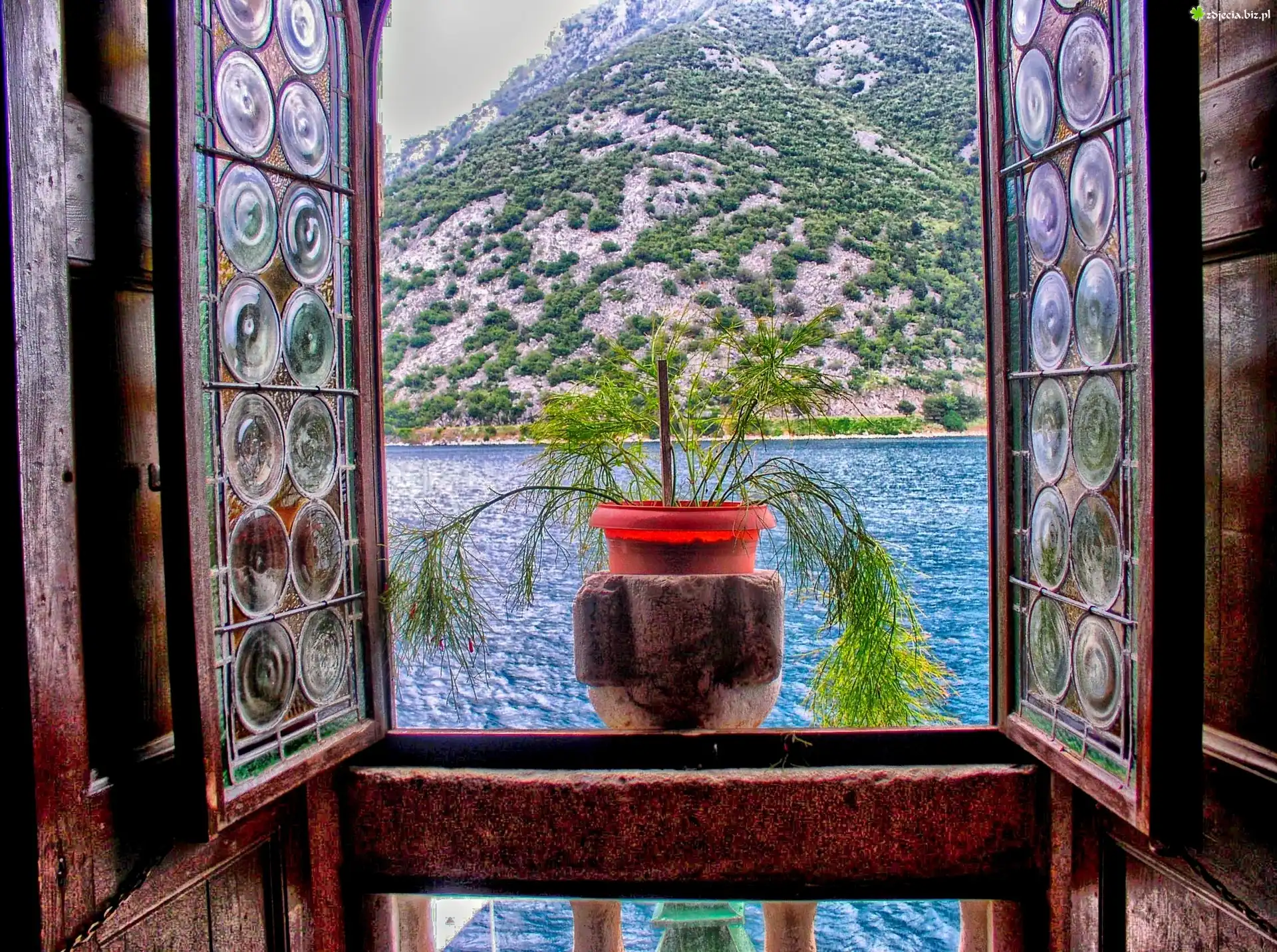 Zdjęcie, Chorwacja, Okno, Hotel, Kwiat, Jezioro, Góry