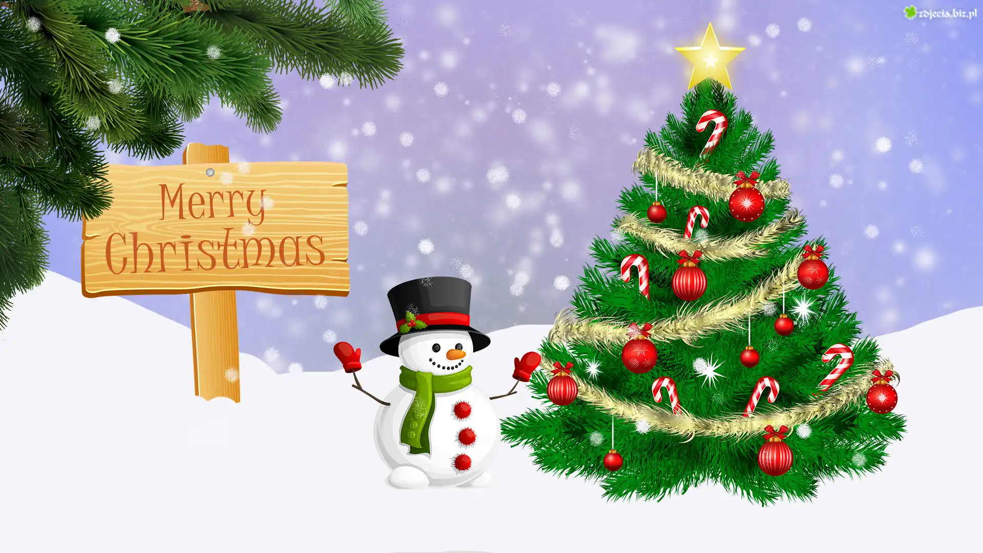 Zdjęcie Świąteczne, Boże Narodzenie, Choinka, Śnieg, Bałwanek, Napis, Merry Christmas