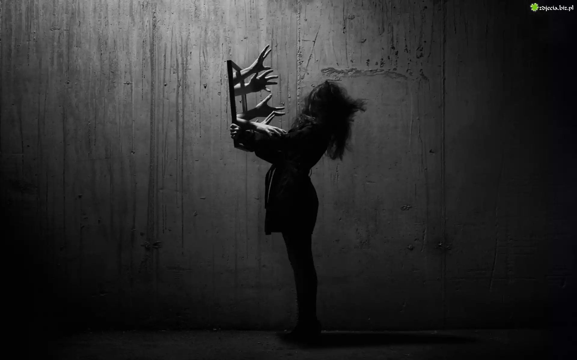 Zdjęcie Ściana, Ramka, Dłonie, Dziewczynka, Mroczne, Czarno-Białe