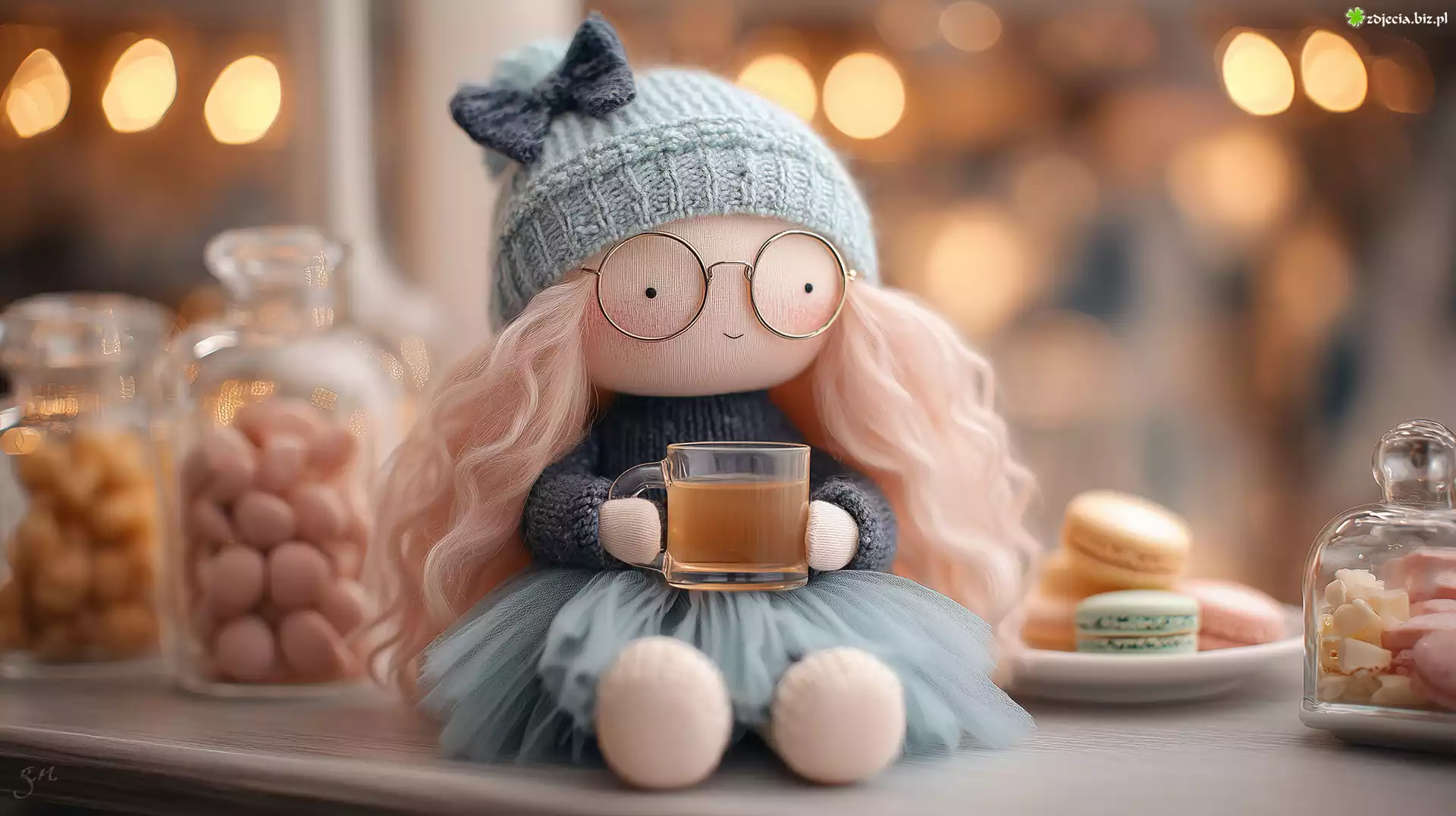 Zdjęcie, Lalka, Szklanka, Herbata, Ciastka, Cukierki, Grafika AI