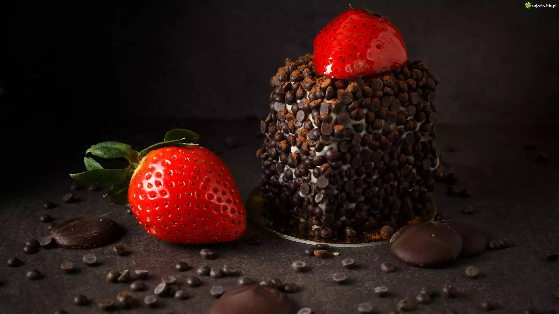 Zdjęcie Ciastko, Talerzyk, Czekolada, Truskawki, Ciemne Tło