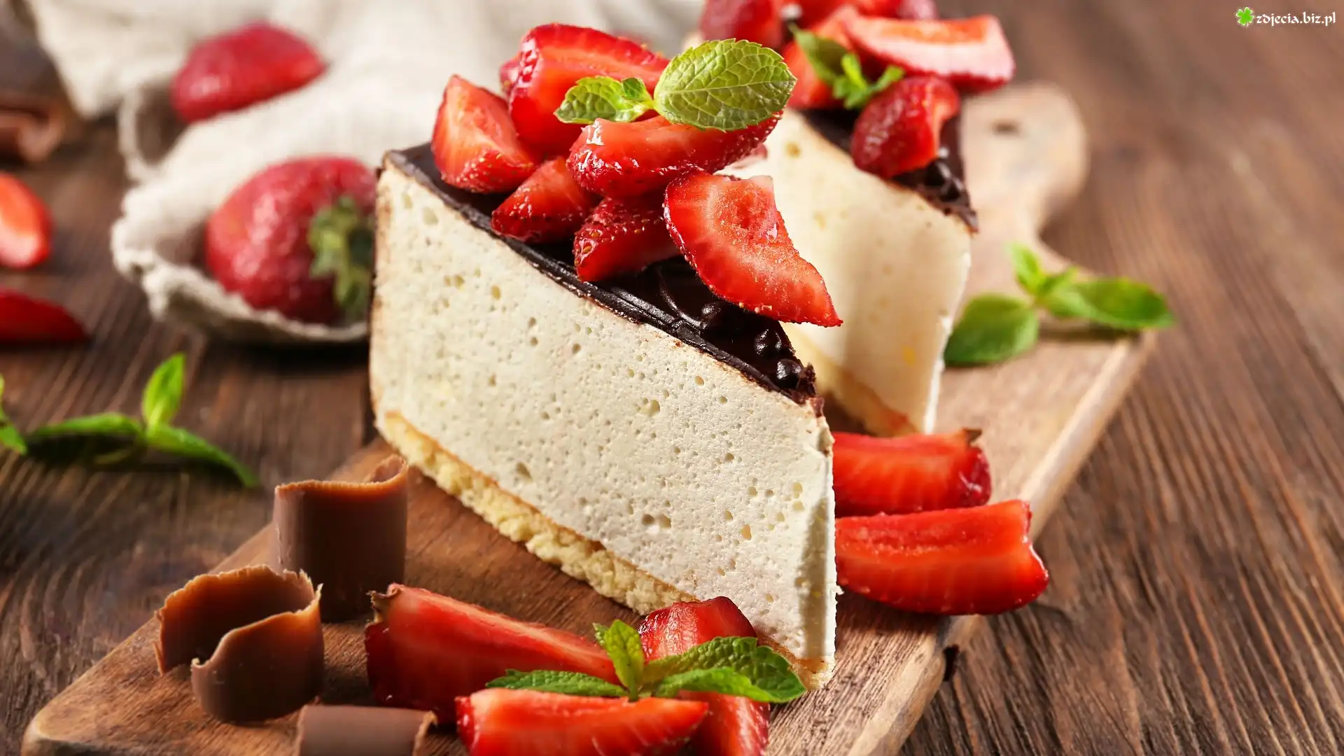 Zdjęcie Ciasto, Sernik, Truskawki, Czekolada, Deska