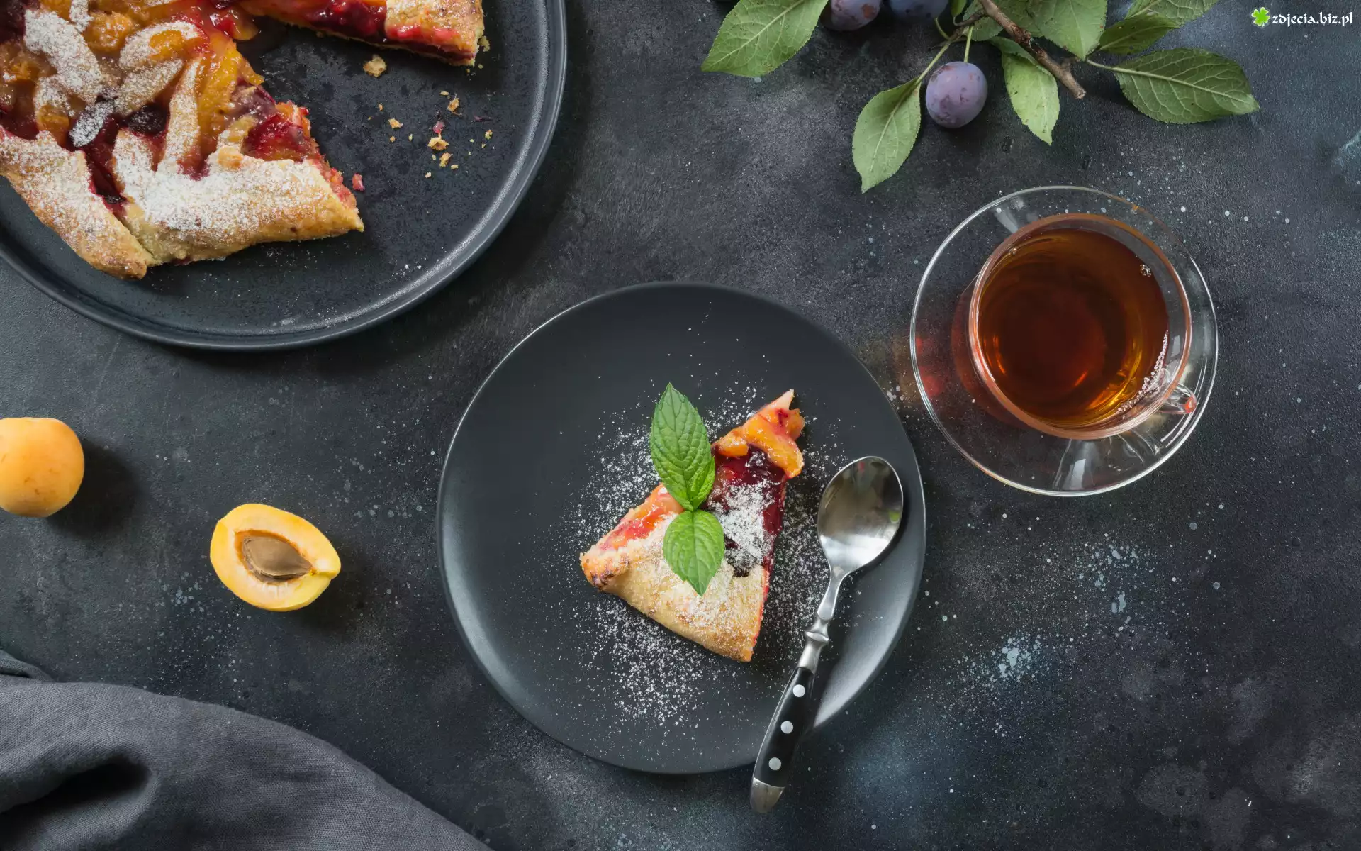 Zdjęcie, Ciasto, Filiżanka, Herbata, Śliwki