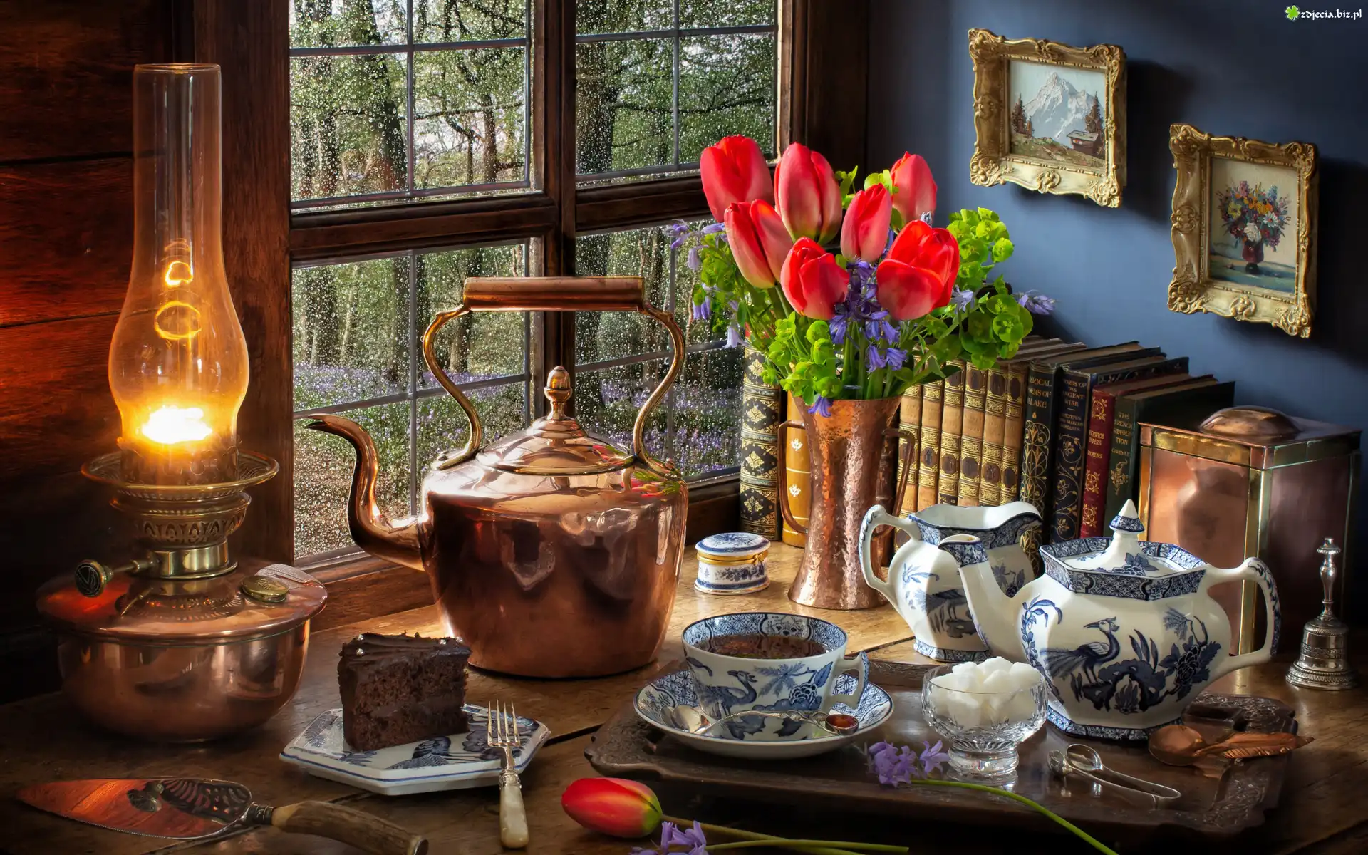 Zdjęcie Lampa naftowa, Czajnik, Herbata, Ciasto, Cukier, Kwiaty, Tulipany, Książki, Obrazy, Okno, Porcelanowa, Zastawa, Kompozycja |
