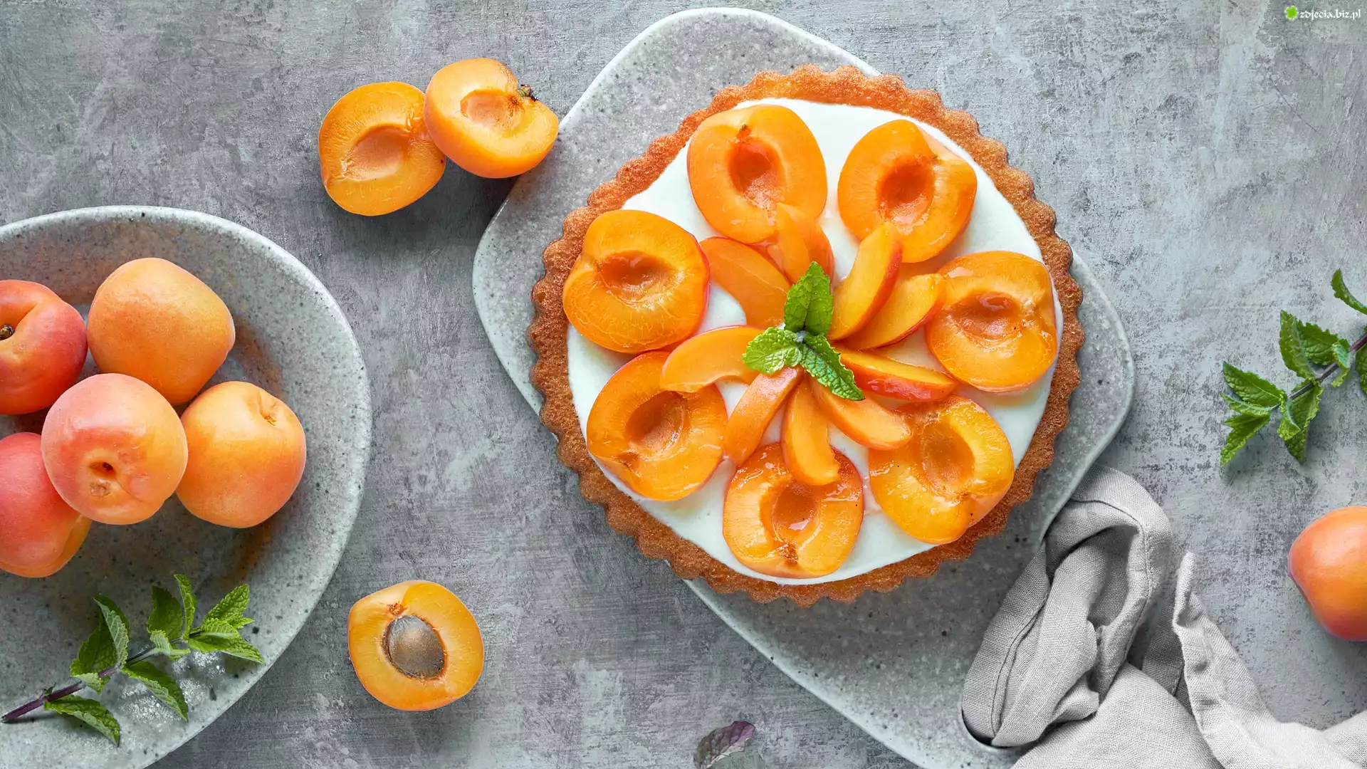 Zdjęcie Ciasto, Morele, Mięta, Talerz