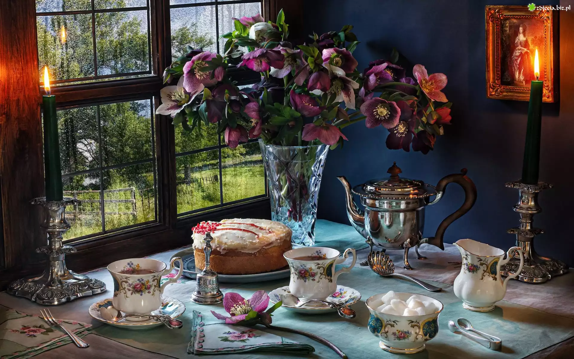 Zdjęcie Kompozycja, Okno, Kwiaty, Ciemierniki, Świece, Ciasto, Filiżanki
