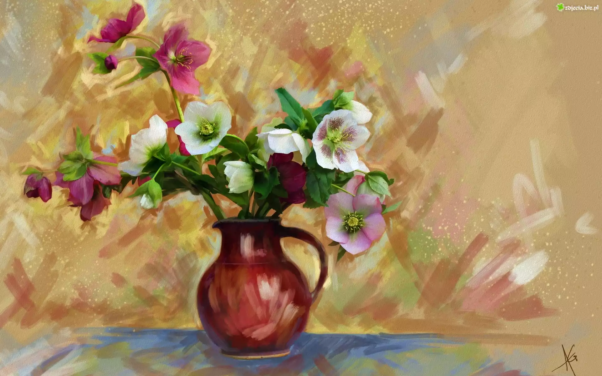 Zdjęcie, Ciemierniki, Kwiaty, Bukiet, Wazon, Reprodukcja obrazu