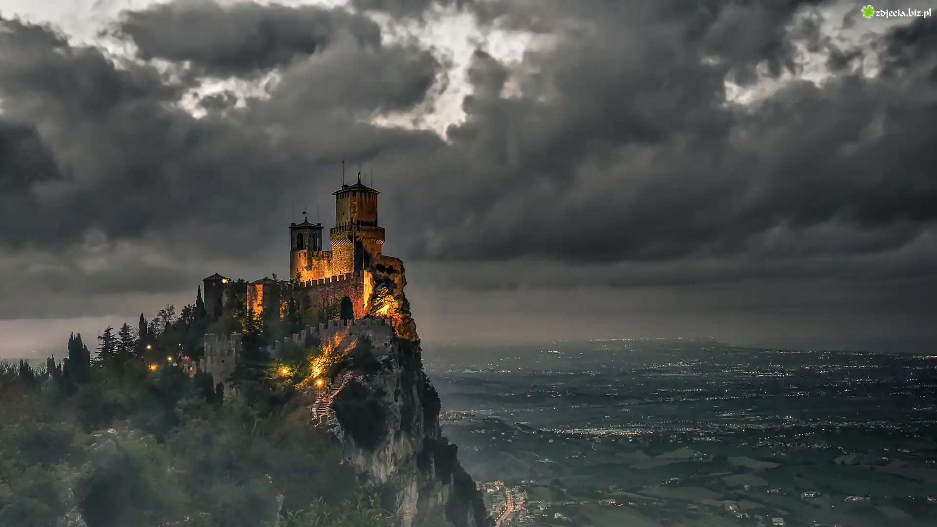 Zdjęcie, Zamek La Rocca o Guaita, Zamek Prima Torre, San Marino, Góra Monte Titano, Noc