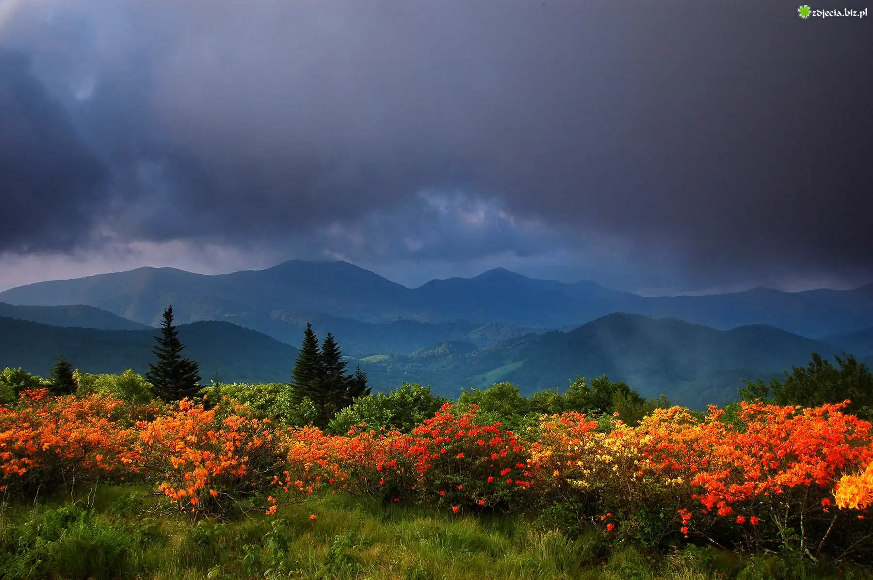 Zdjęcie Ciemne, Chmury, Góry, Kwiaty