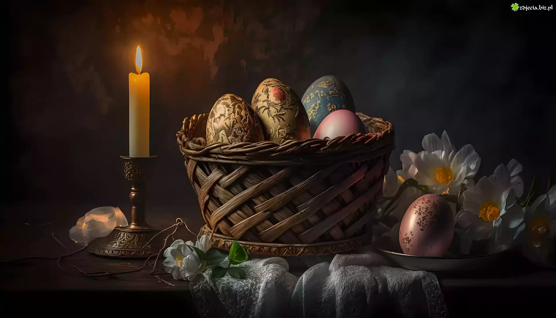 Zdjęcie Koszyk, Świeczka, Pisanki, Ciemne tło, Wielkanoc