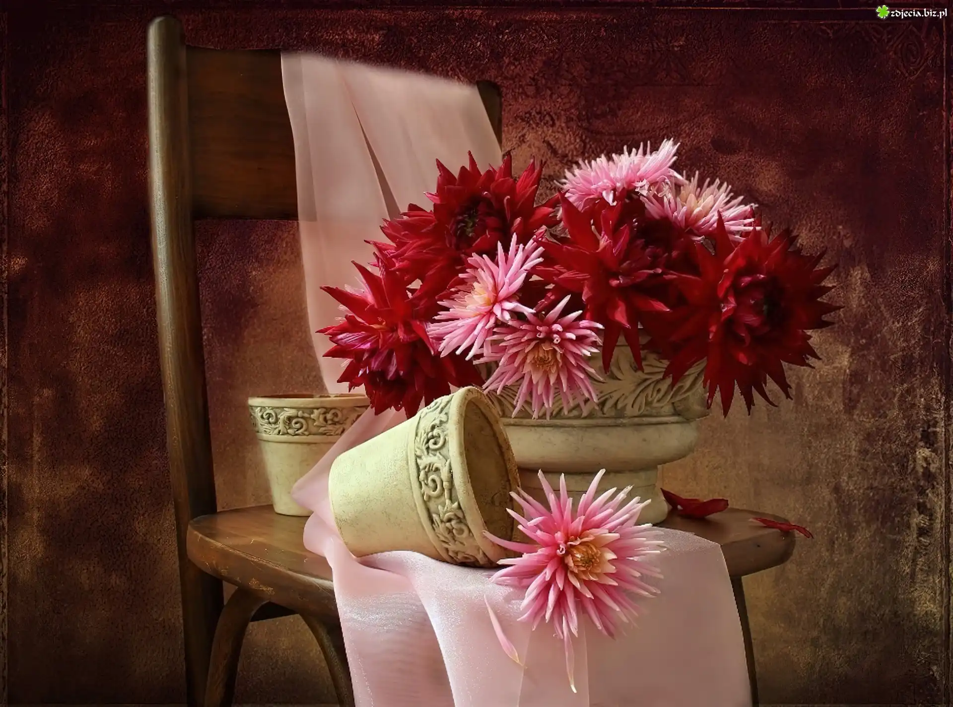 Zdjęcie Ciemno, Różowe, Astry, Doniczki, Krzesło