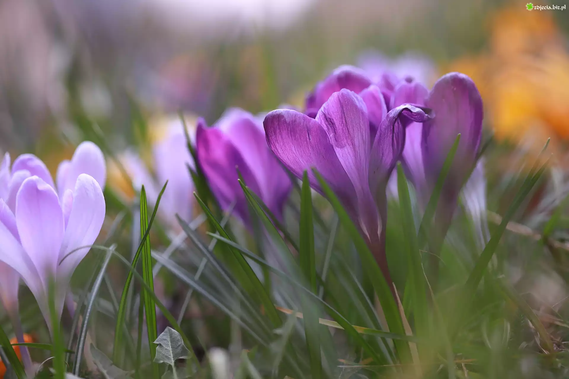 Zdjęcie Jasnofioletowe, Ciemnofioletowe, Krokusy, Kwiaty, Trawa