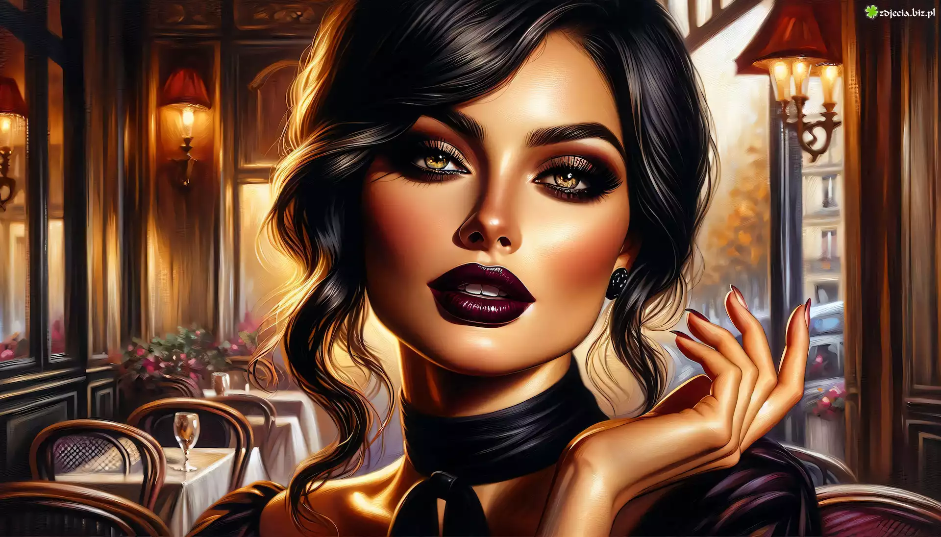 Zdjęcie Kobieta, Ciemnowłosa, Makijaż, Kawiarnia, Grafika