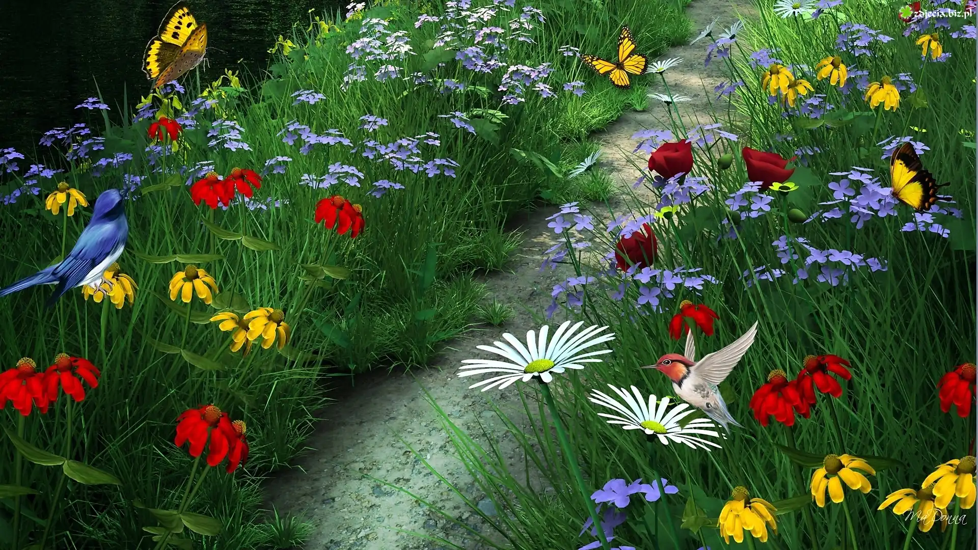 Zdjęcie, Ścieżka, Kolorowe, Polne, Kwiaty, Ptaszki, Motyle, Rzeka
