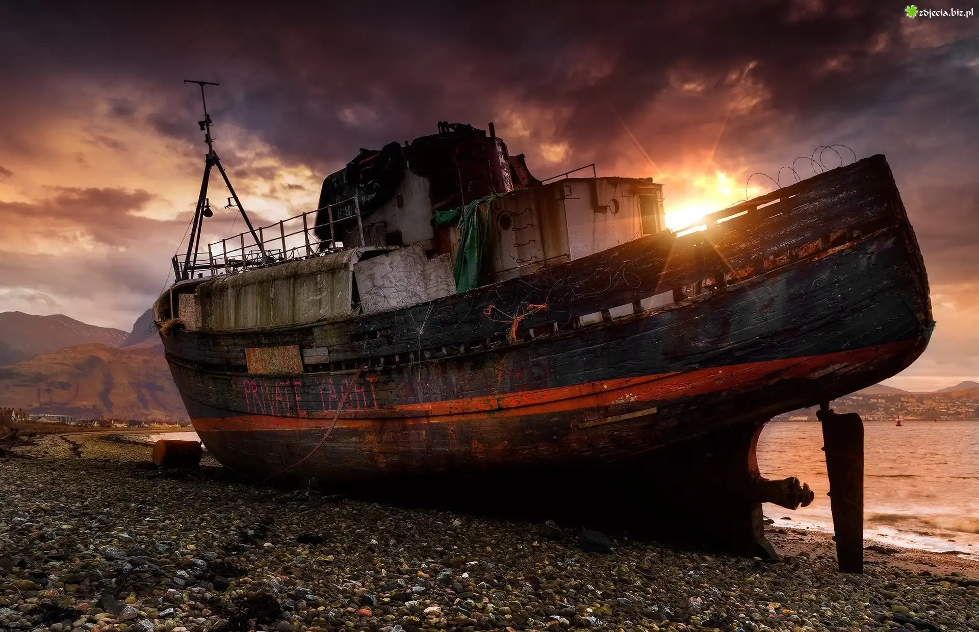Zdjęcie, Szkocja, Corpach, Jezioro Linnhe, Wrak, Kamienie, Plaża