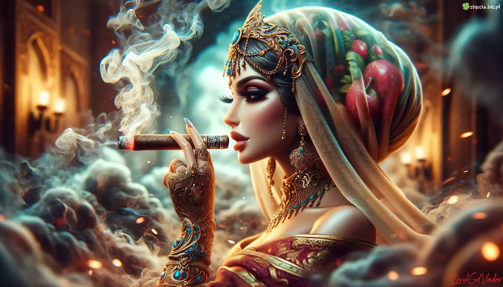 Zdjęcie Kobieta, Makijaż, Biżuteria, Cygaro, Chusta, Dym, Grafika