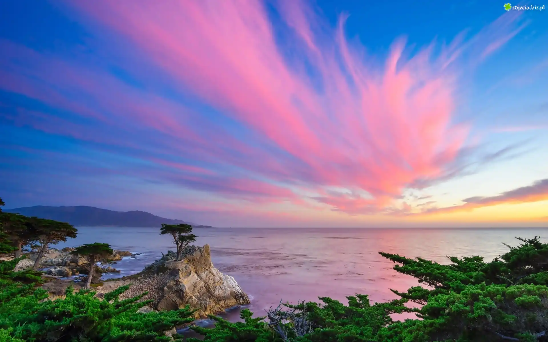 Zdjęcie Samotny, Cyprys, Skała, Wybrzeże, Kalifornii, Zachód, Słońca