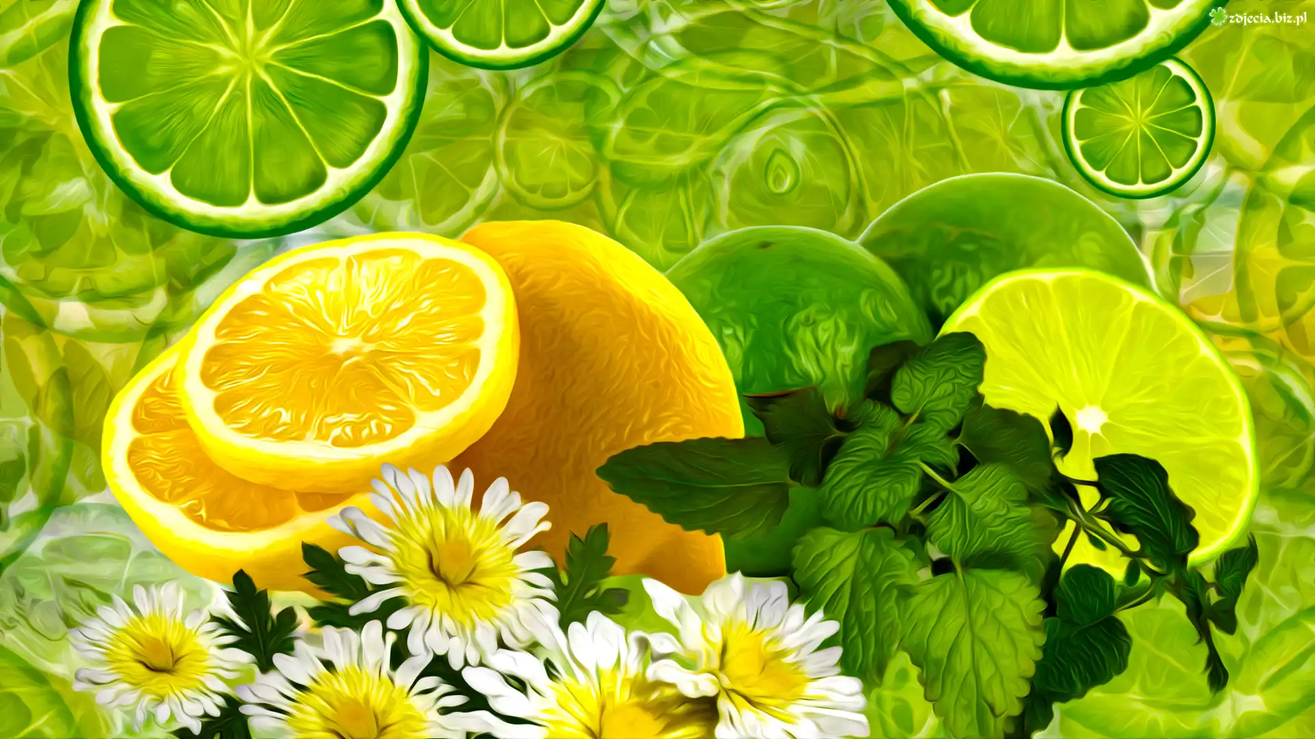 Zdjęcie Cytryna, Limonka, Mięta, Kwiaty, Grafika