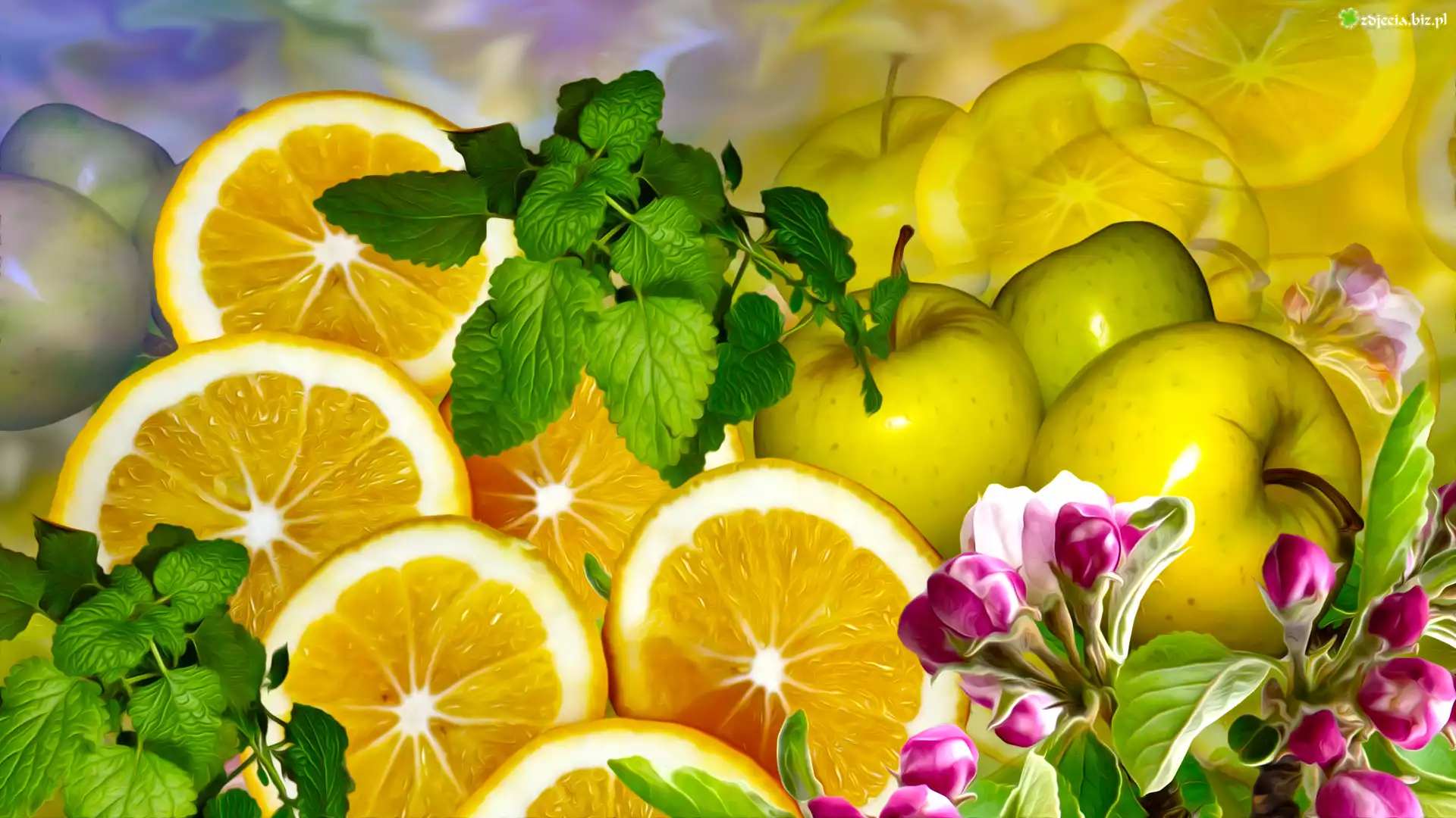 Zdjęcie Cytryny, Kwiaty, Jabłka, Mięta, Grafika