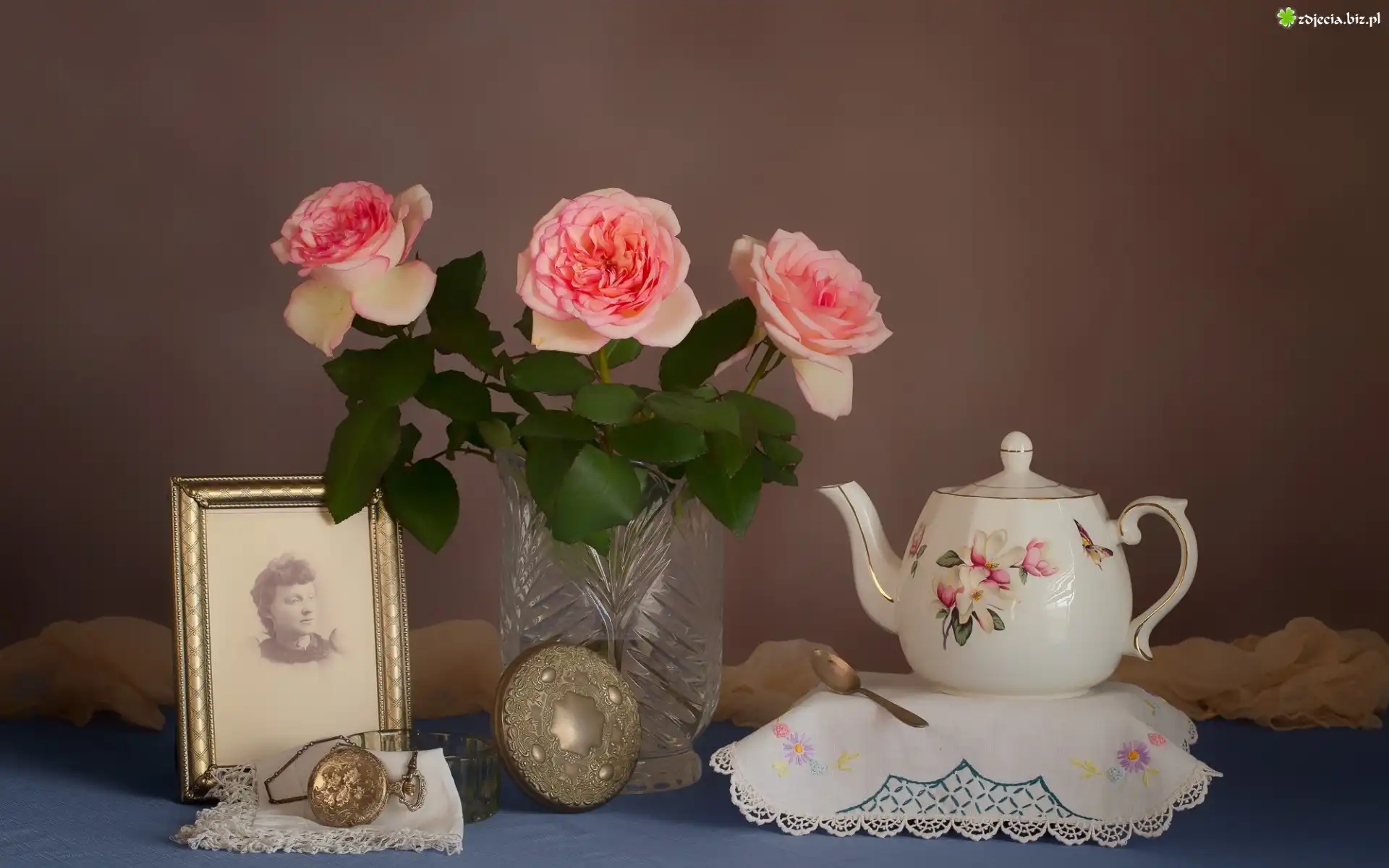 Zdjęcie Kompozycja, Czajnik, Kwiaty, Bukiet, Róże, Fotografia, Łyżeczka, Serwetki