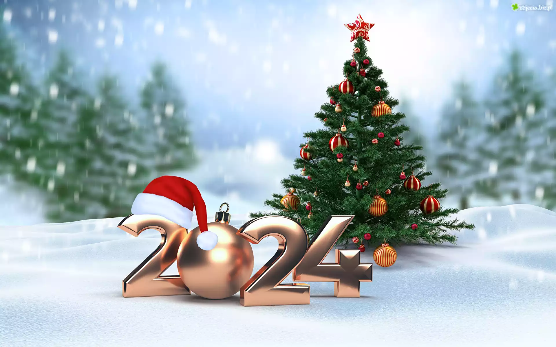 Zdjęcie Zima, Choinka, Bombki, Śnieg, Nowy Rok, 2024, Srebrne, Cyfry, Czapka św Mikołaja