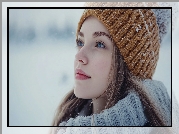 Zdjęcie, Długowłosa, Kobieta, Brązowa, Czapka, Szal, Śnieg