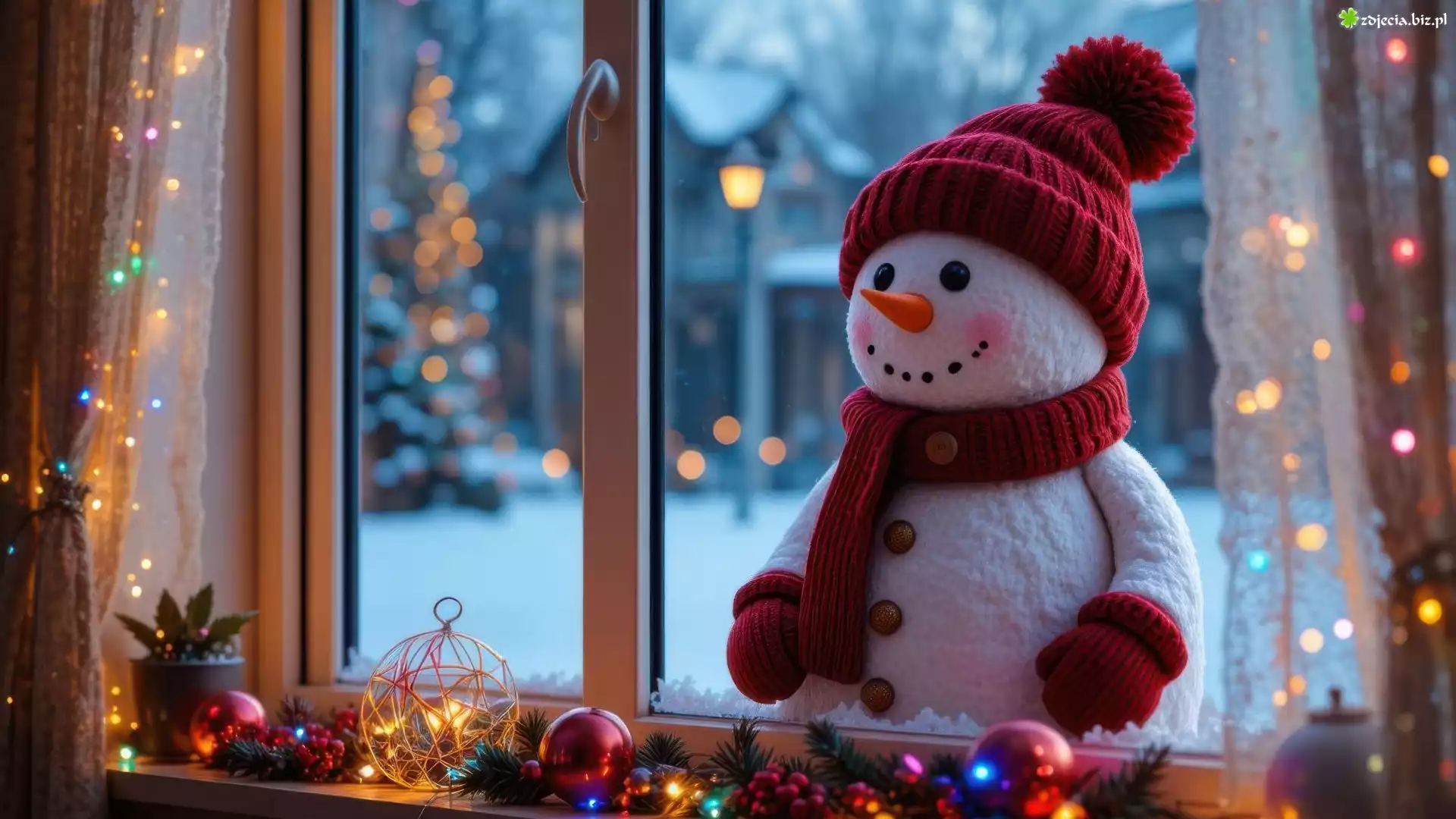Zdjęcie Bałwanek, Czapka, Szalik, Okno, Dekoracje