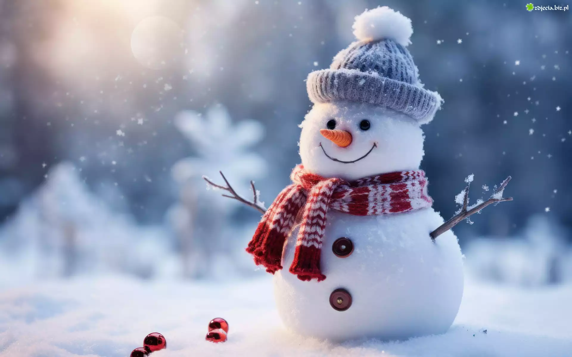 Zdjęcie Zima, Bałwan, Uśmiech, Czapka, Śnieg, Szalik
