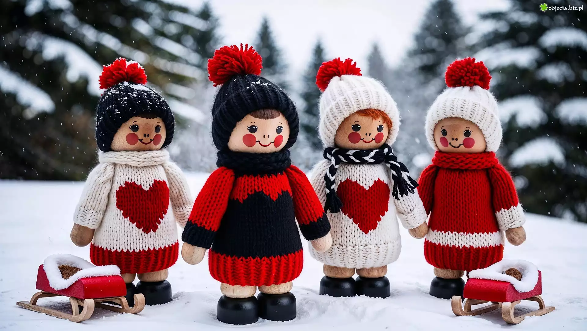 Zdjęcie Zima, Drewniane, Lalki, Czapki, Swetry, Sanki, Grafika