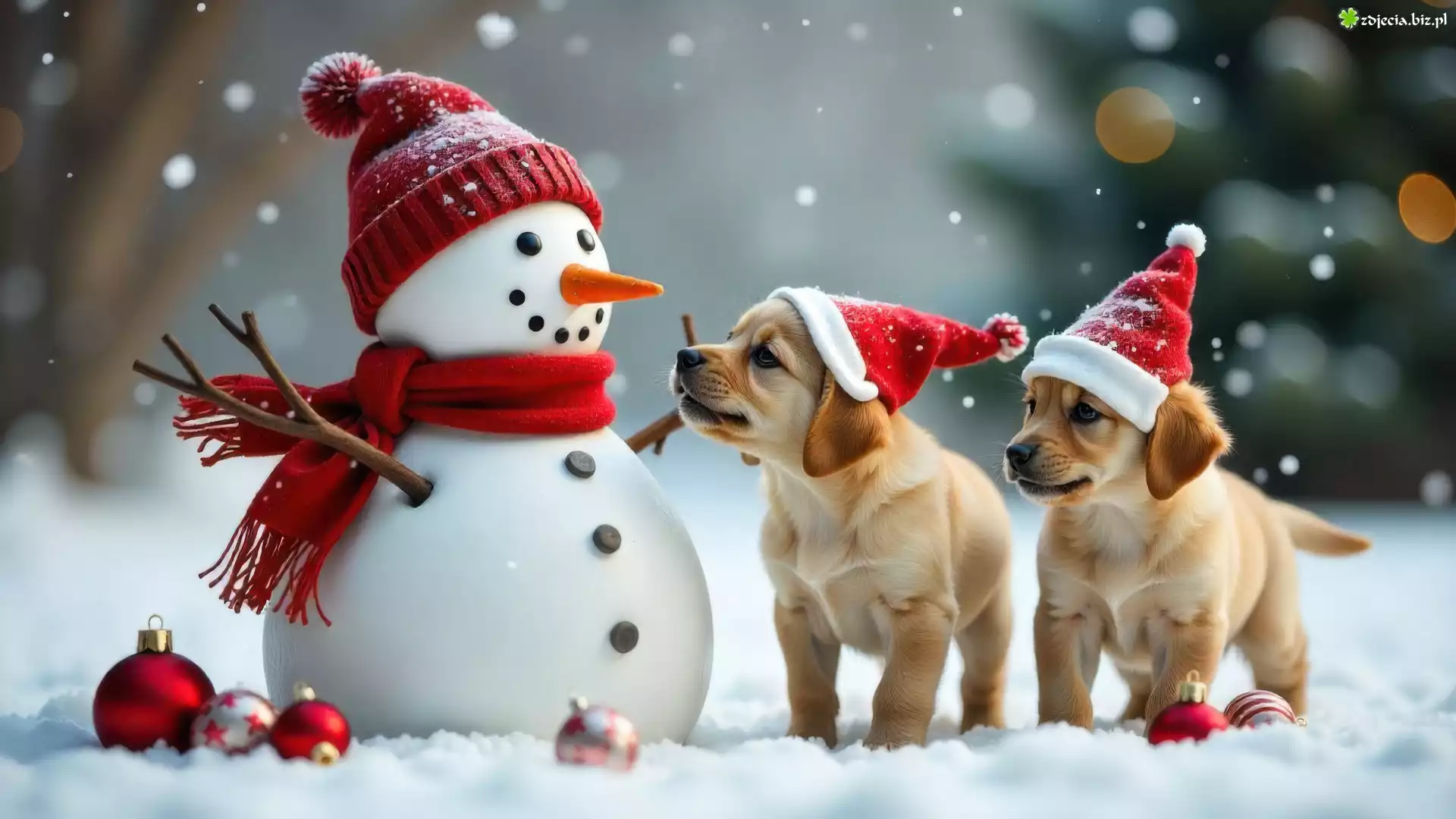 Zdjęcie Zima, Psy, Szczeniaki, Czapki, Mikołaja, Bałwanek, Bombki