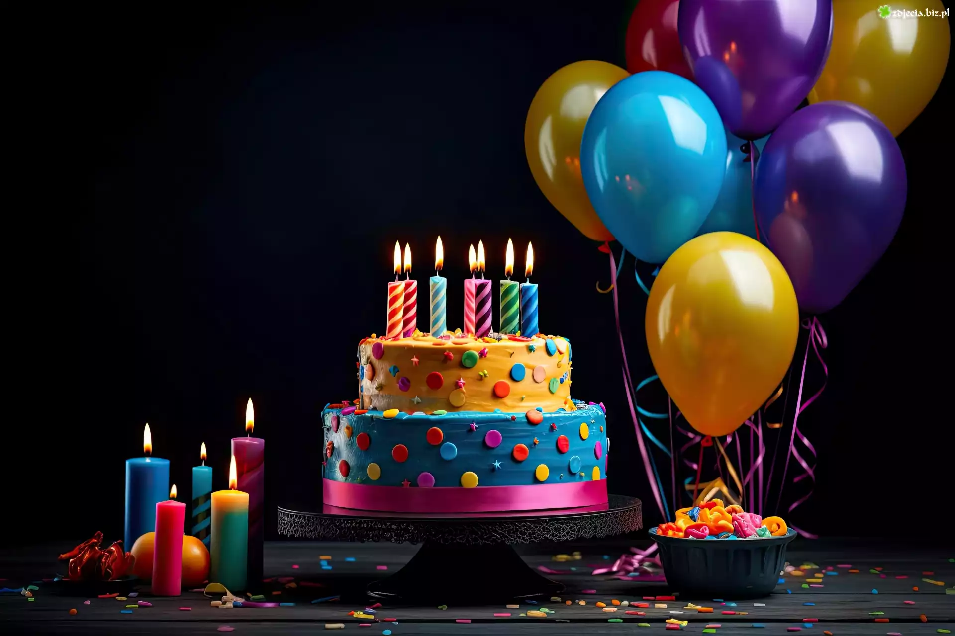 Zdjęcie Urodziny, Ciasto, Tort, Zapalone, Świeczki, Miseczka, Słodycze, Balony, Stół, Czarne, Tło, Grafika |