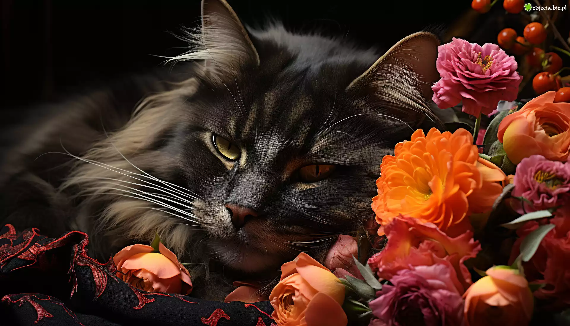 Zdjęcie Kot, Czarny, Kolorowe, Kwiaty, Grafika