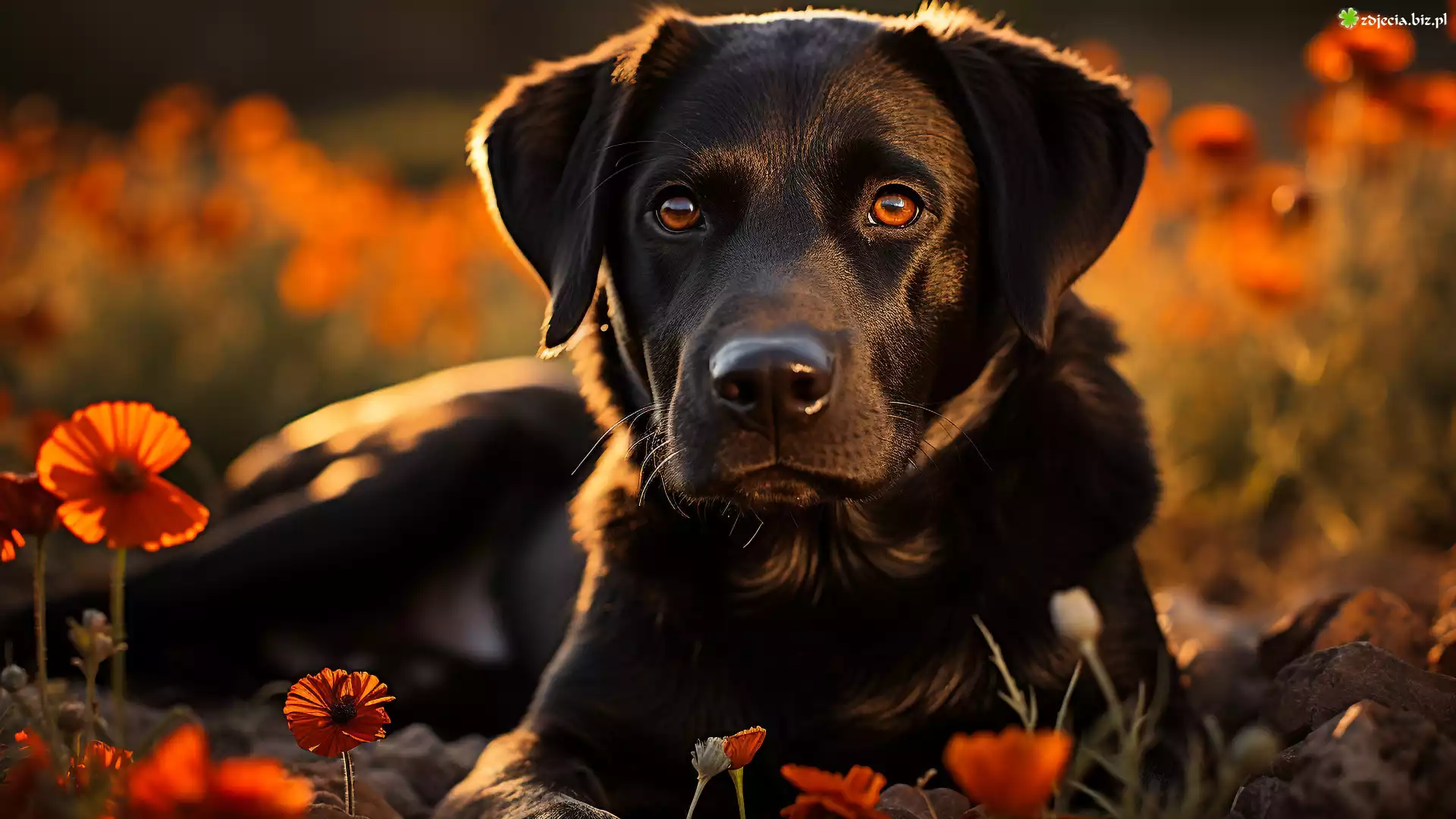 Zdjęcie Pies, Czarny, Mordka, Kwiaty, Maki