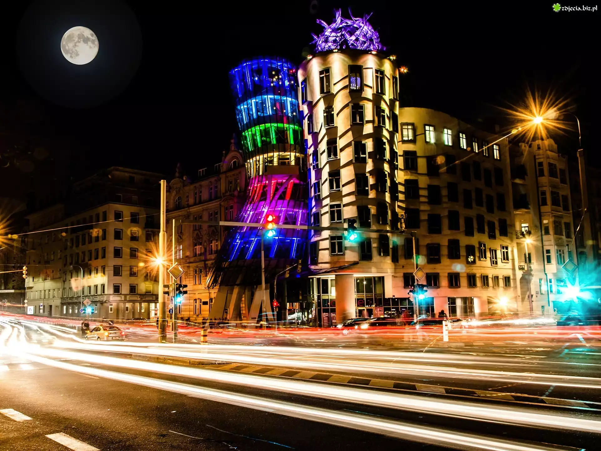 Zdjęcie Praga, Czechy, Tańczący dom, Oświetlone, Domy, Ulica, Miasto nocą