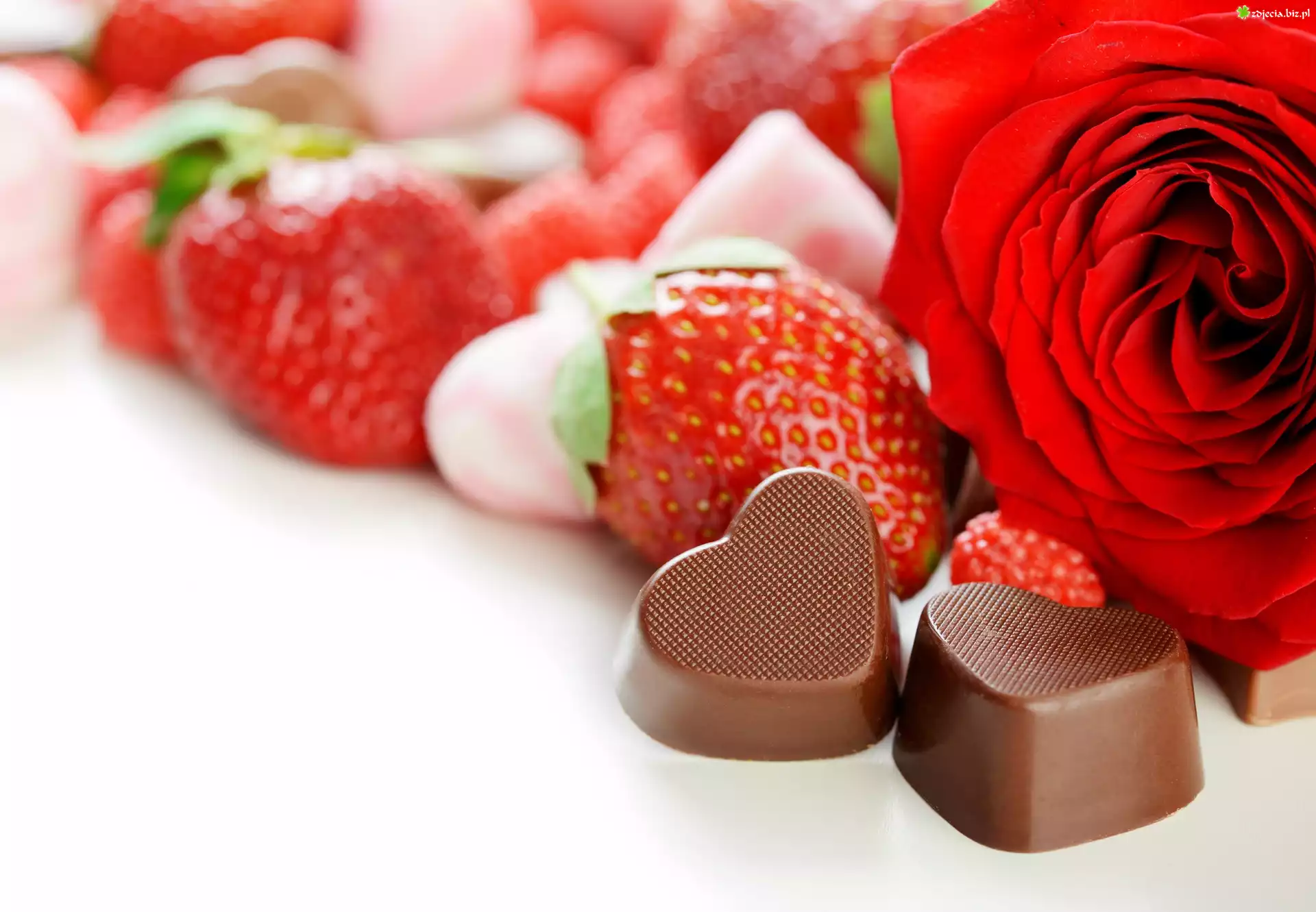 Zdjęcie Czekoladki, Pralinki, Serduszka, Czerwona, Róża, Truskawki