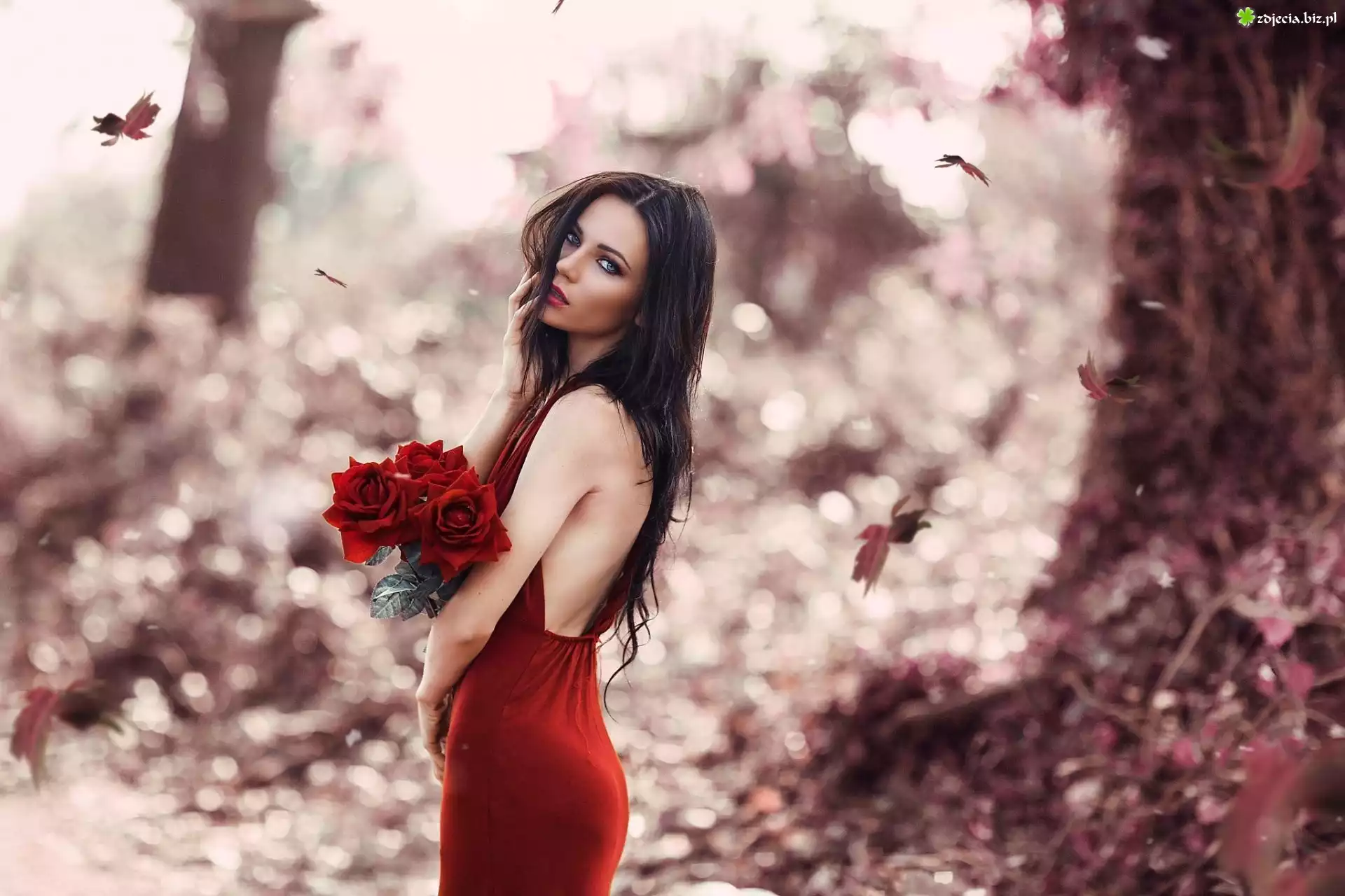 Zdjęcie Czerwona, Sukienka, Brunetka, Róże