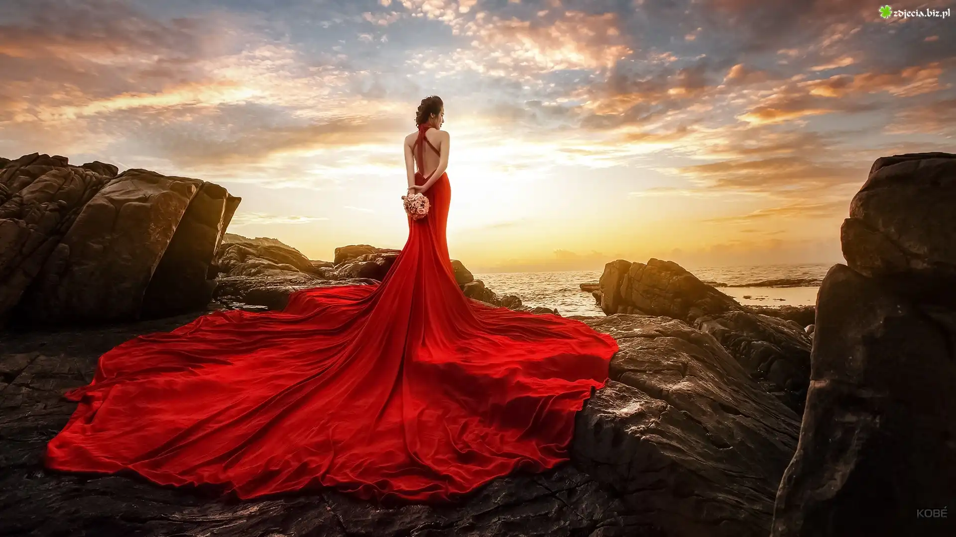 Zdjęcie Kobieta, Czerwona, Sukienka, Zachód słońca, Skały, Morze