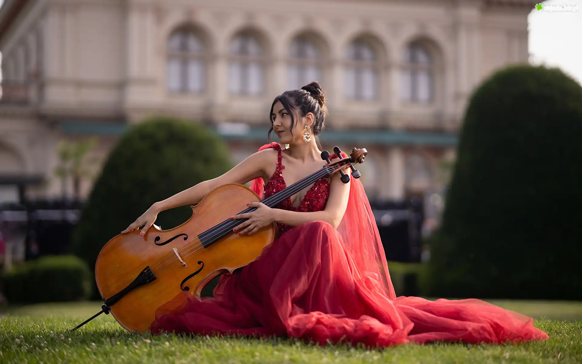 Zdjęcie Kobieta, Czerwona, Suknia, Wiolonczela, Rozmycie