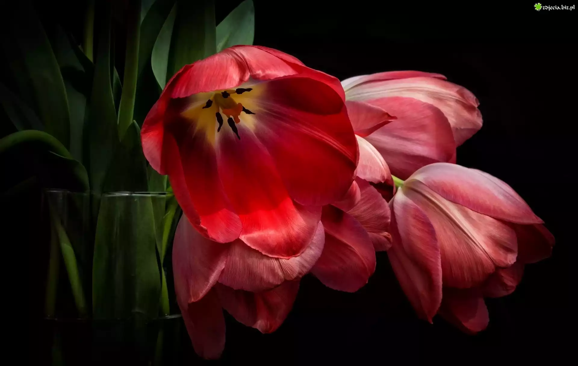 Zdjęcie, Czerwone, Tulipany, Kwiaty, Wazon, Czarne tło