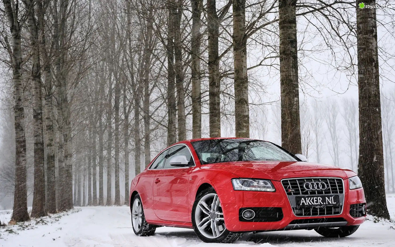 Zdjęcie Czerwone, Audi S5, Las, Droga, Śnieg