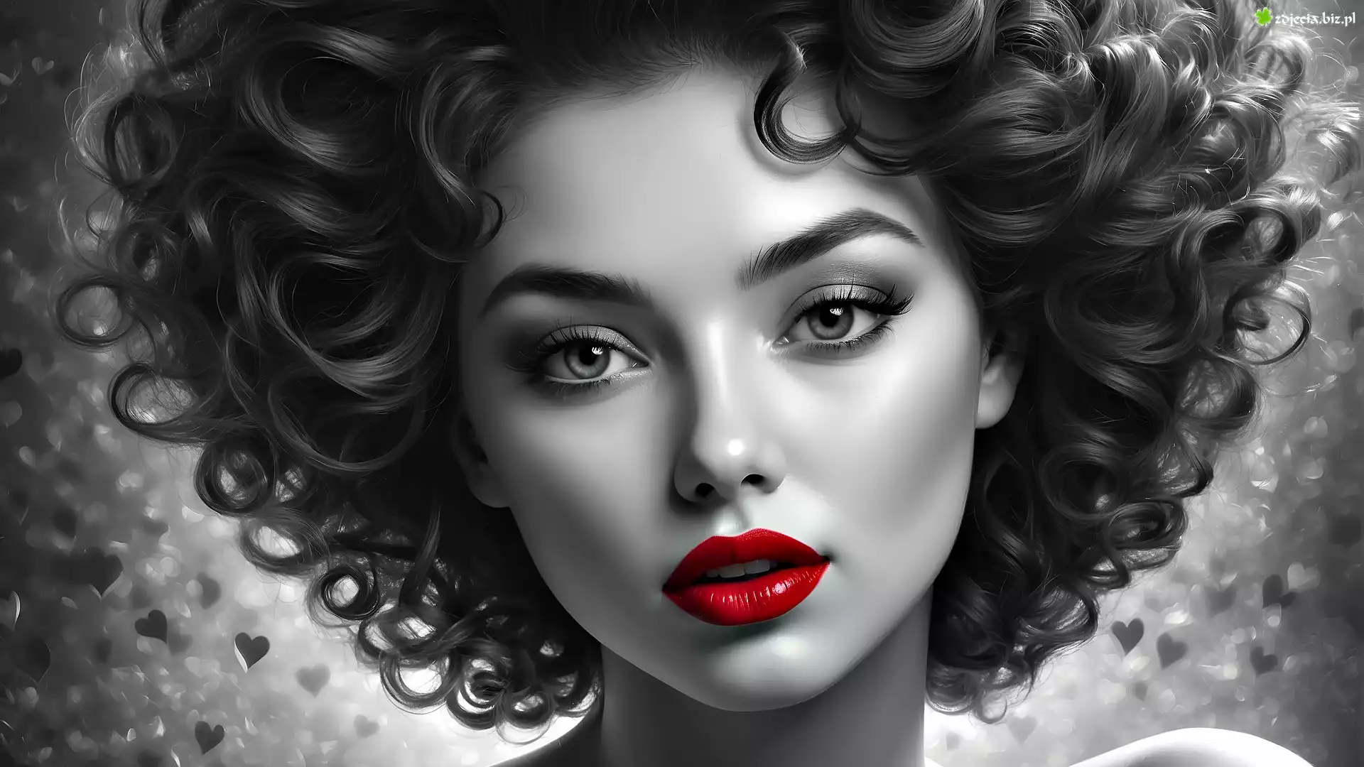 Zdjęcie Kobieta, Twarz, Loki, Czerwone, Usta, Grafika