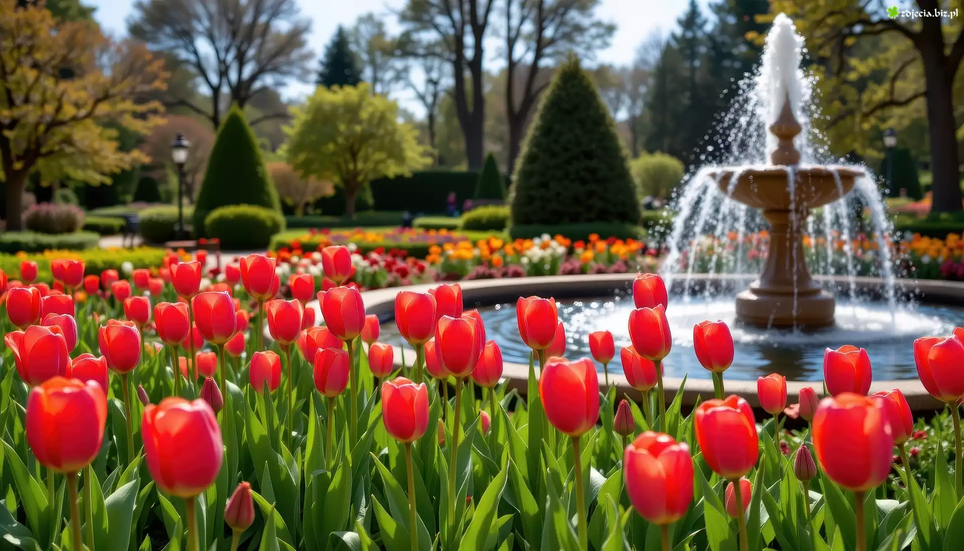 Zdjęcie Park, Fontanna, Kwiaty, Czerwone, Tulipany, Drzewa, Wiosna