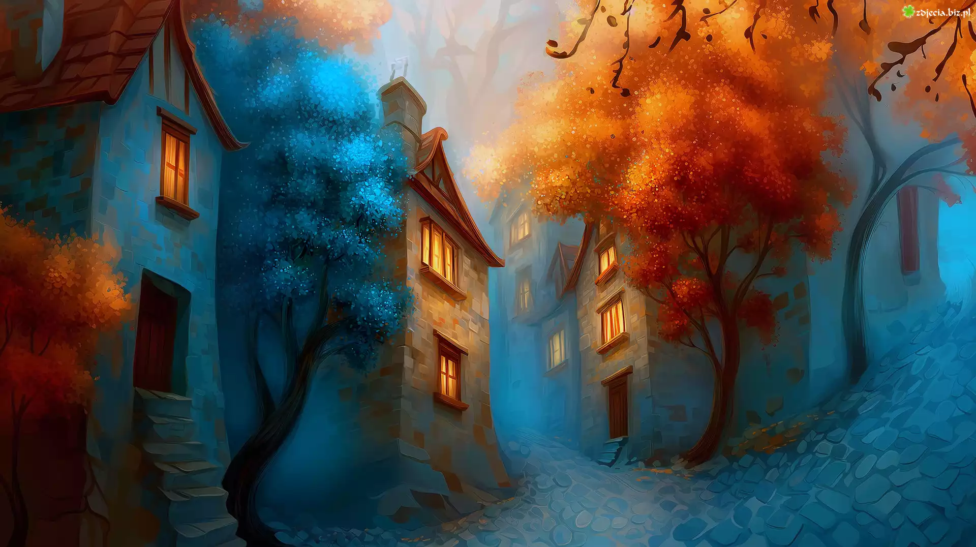 Zdjęcie Domy, Uliczki, Niebieskie, Czerwone, Drzewa, Grafika AI