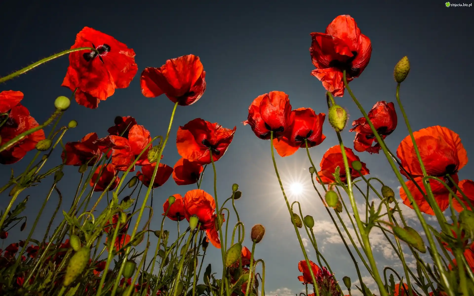 Zdjęcie Czerwone, Maki, Niebo, Słońce