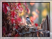 Zdjęcie Sikorka, Sosnówka, Płot, Czerwone, Liście, Grafika AI