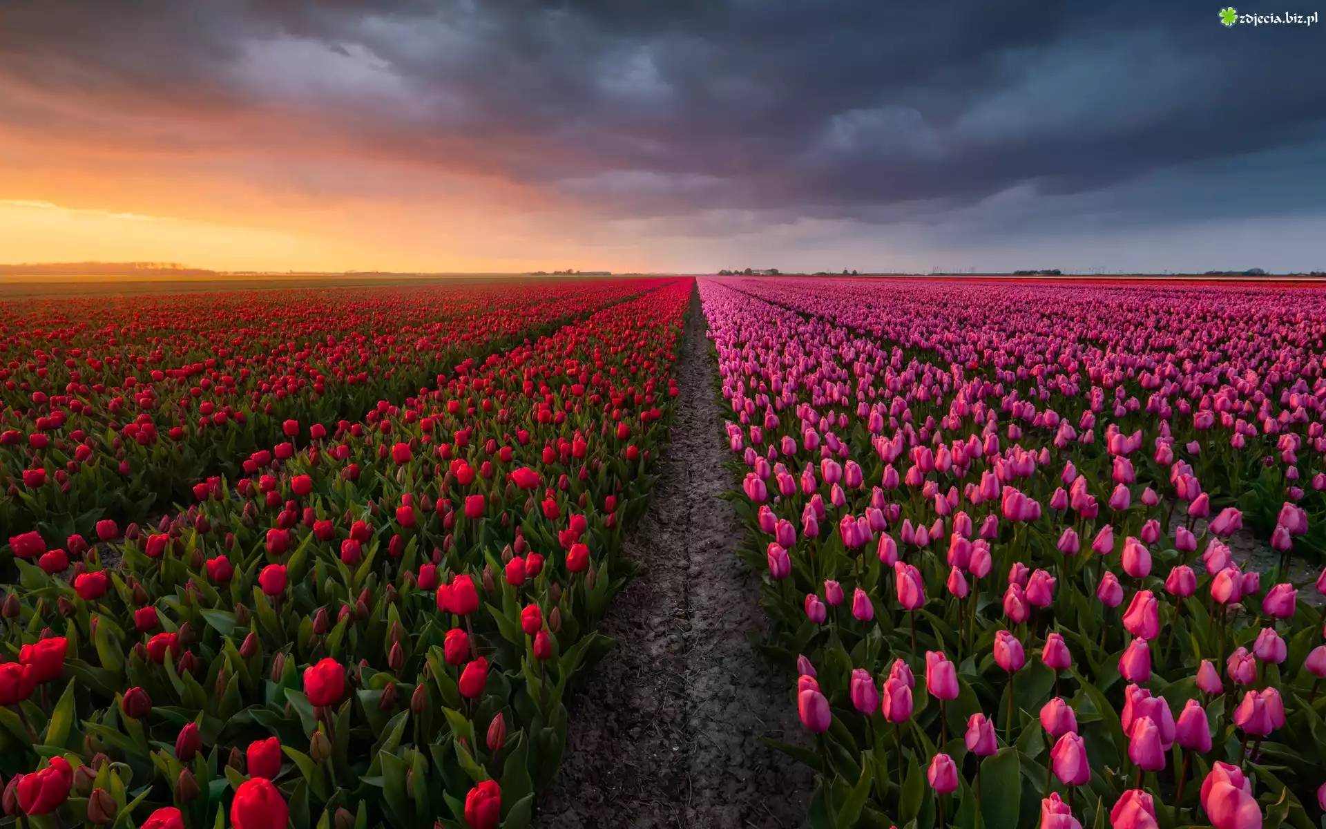 Zdjęcie Pole, Plantacja, Różowe, Czerwone, Tulipany, Zachód słońca