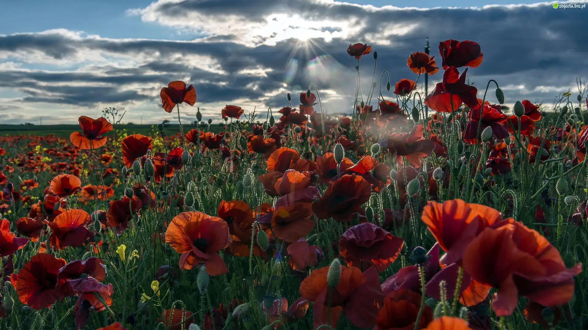 Zdjęcie Czerwone, Maki, Promienie, Słońca, Chmury
