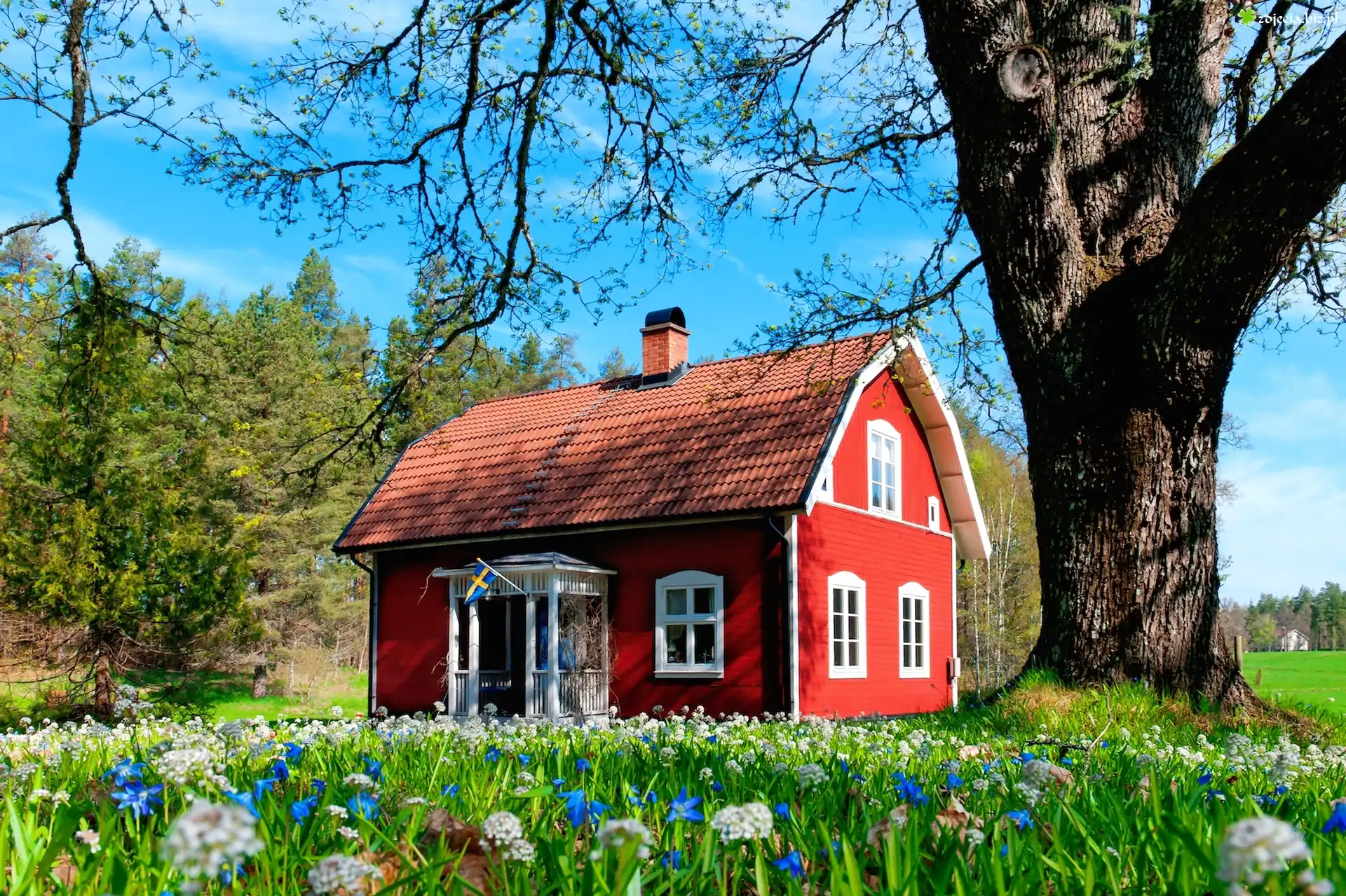 Zdjęcie Czerwony, Domek, Kwiaty, Drzewa